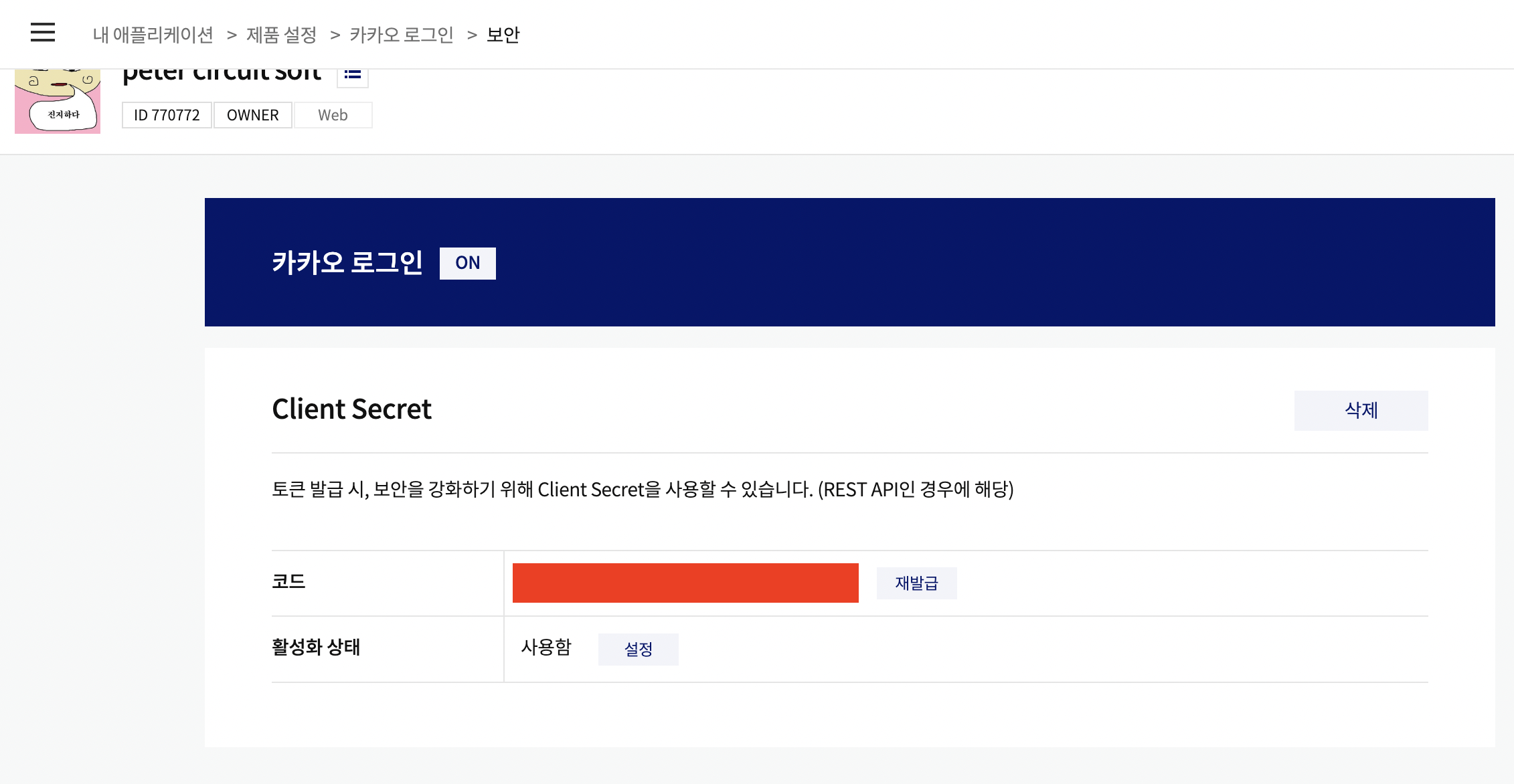 이제 설정은 거의 끝났어. 이제 nextauth에서 카카오 rest api에 접근하기 위해 필요한 client id, client secret을 얻어와야 .env.local 파일에 넣어줄겨. 아까 말했지? rest api 키가 client id고 client secret은 내 애플리케이션 -> 제품 설정 -> 카카오 로그인 -> 보안 탭에서 찾을 수 있어.