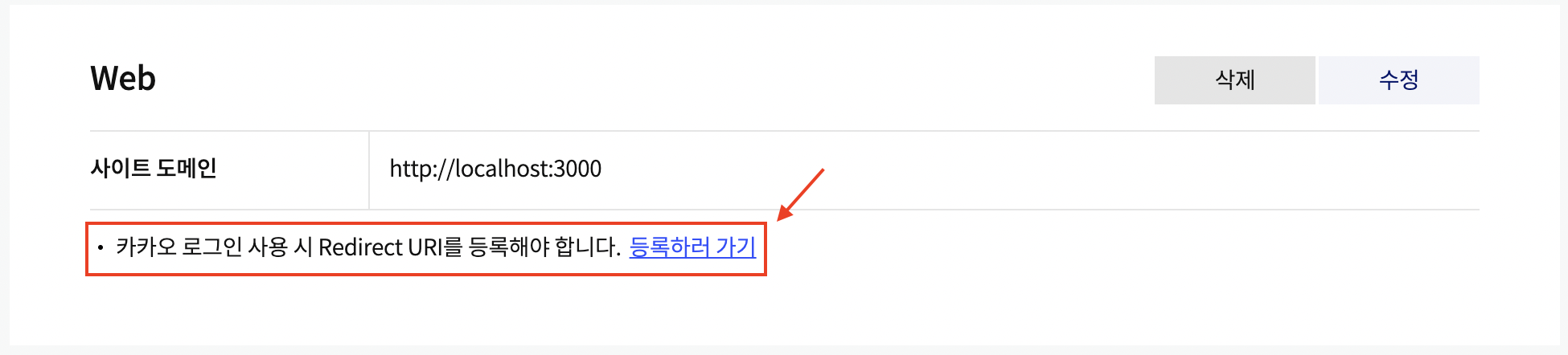 도메인을 설정하고나면 아래 화면처럼 설정한게 보이는데 그 아래 Redirect URI 등록해야 함. 등록하기 눌러서 이동.