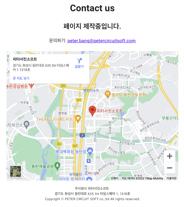 나머지 제작중인 페이지들에는 "제작중인 페이지입니다." 로 채웠고 문의하기 페이지에는 google map을 iframe으로 넣었어. 지도는 Kakaomap api같은 걸로 할 수도 있는데 회사 등록하고 승인받고 하는 절차에 시간이 좀 걸리는 듯하고 naver map api를 사용하자니 naver cloud로 이전이 되서 가입하고 api 키 발급받고 막 그래야 해서 더 귀찮~ 그에 비해 구글은 거의 광속으로 회사가 등록이 되고 api 키도 필요없고 iframe 자체도 보기에 나쁘지 않더라구. 그래서 google map 으로 당첨!