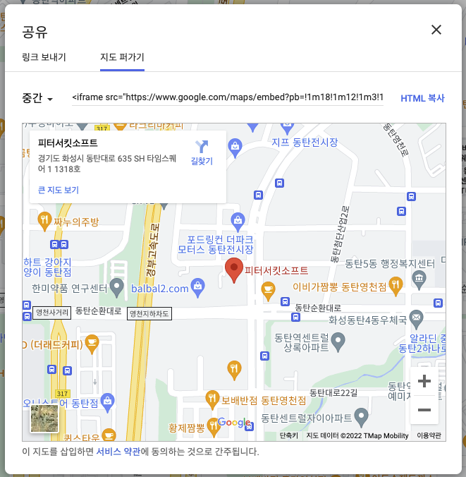 회사 등록은 구글 맵(https://www.google.com/maps) 접속해서 메뉴->비즈니스 추가를 클릭 -> 회사 정보를 주욱 입력하면 끝. 그 다음 회사가 구글맵에 표시된 상태에서 공유버튼을 눌르면 아래👇와 같은 화면이 나오는데 여기서 지도 퍼가기 탭 -> html 복사 -> contactus.tsx 파일의 <main> 태그 안에 붙여넣기 하면 끝!
