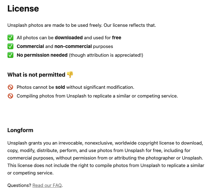 대부분의 이미지에 "Free to use under the Unsplash License" 라고 되어 있어. Unsplash license는 아래👇 와 같은데. 모든 이미지는 공짜로 다운로드 가능함. 상업적 비상업적 용도 모두 가능. 사용하는데에 허가가 필요하지 않음. 하지만 큰 수정없이 재판매하는 건 금지. unsplash와 비슷한 경쟁사에 복제하는 거 금지. 그러니까 걍 공짜로 사용가능하다는 것! 참고!