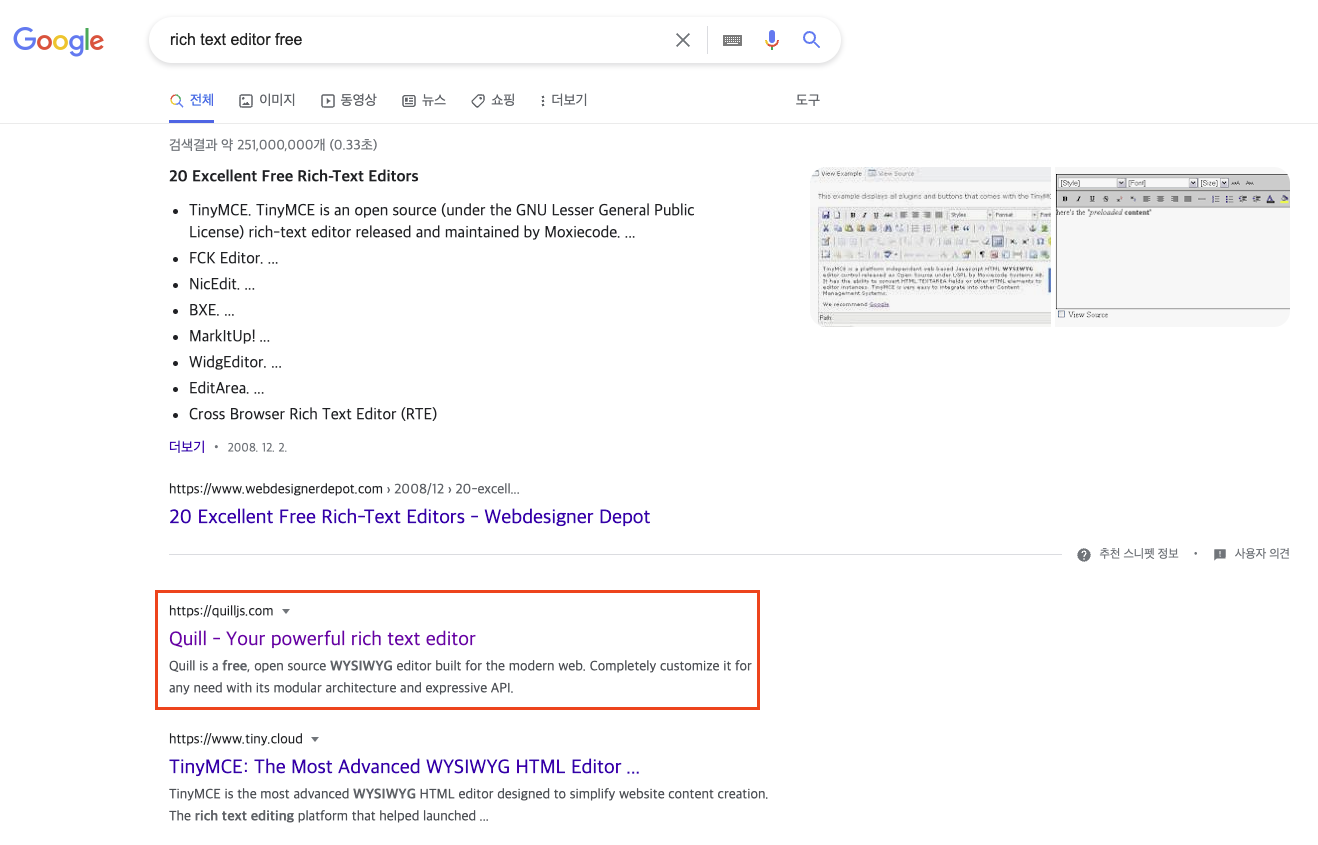 이왕 하는 거 약간 난이도가 있는 버전으로 구현해보기로 결정했어. aws amplify에도 익숙해져야 하고 말이지. 먼저 text editor를 구현해보자구. 보통 rich text editor 라고 부르는데 WYSIWYG(what you see is what you get) 편집기라고도 하고.. 내가 보기에는 방식에 가깝지만. 암튼 rich text editor js library는 많은 종류가 있는데 난 구글에서 공짜 중에 가장 위에 검색되는 거 사용할거야. 그러니까 quilljs라는 게 보이네. 고민하지말고 일단 가보자구.