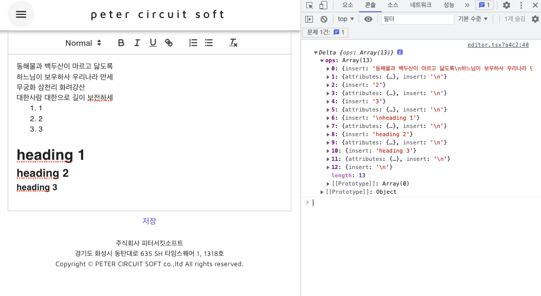 테스트를 해보면 아래와 같이 getContents()가 잘 동작하는 걸 확인할 수 있어. getContents()는 delta형식의 객체를 반환하지. 👉👉 https://quilljs.com/docs/delta/