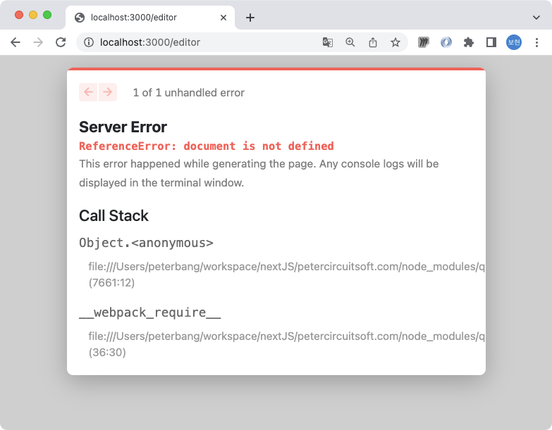 하면 에러가 발생해. document가 defined 되어 있지 않다고 그러네. 이건 window 객체가 생성이 안되서 그 안에 있는 document 객체도 undefined 이기 때문에 발생한다고 하는데... 잘 이해가 안되지만 quill은 import할 때 window객체가 필요한가봐... 왤까???? 아는 사람 좀 알려줘.