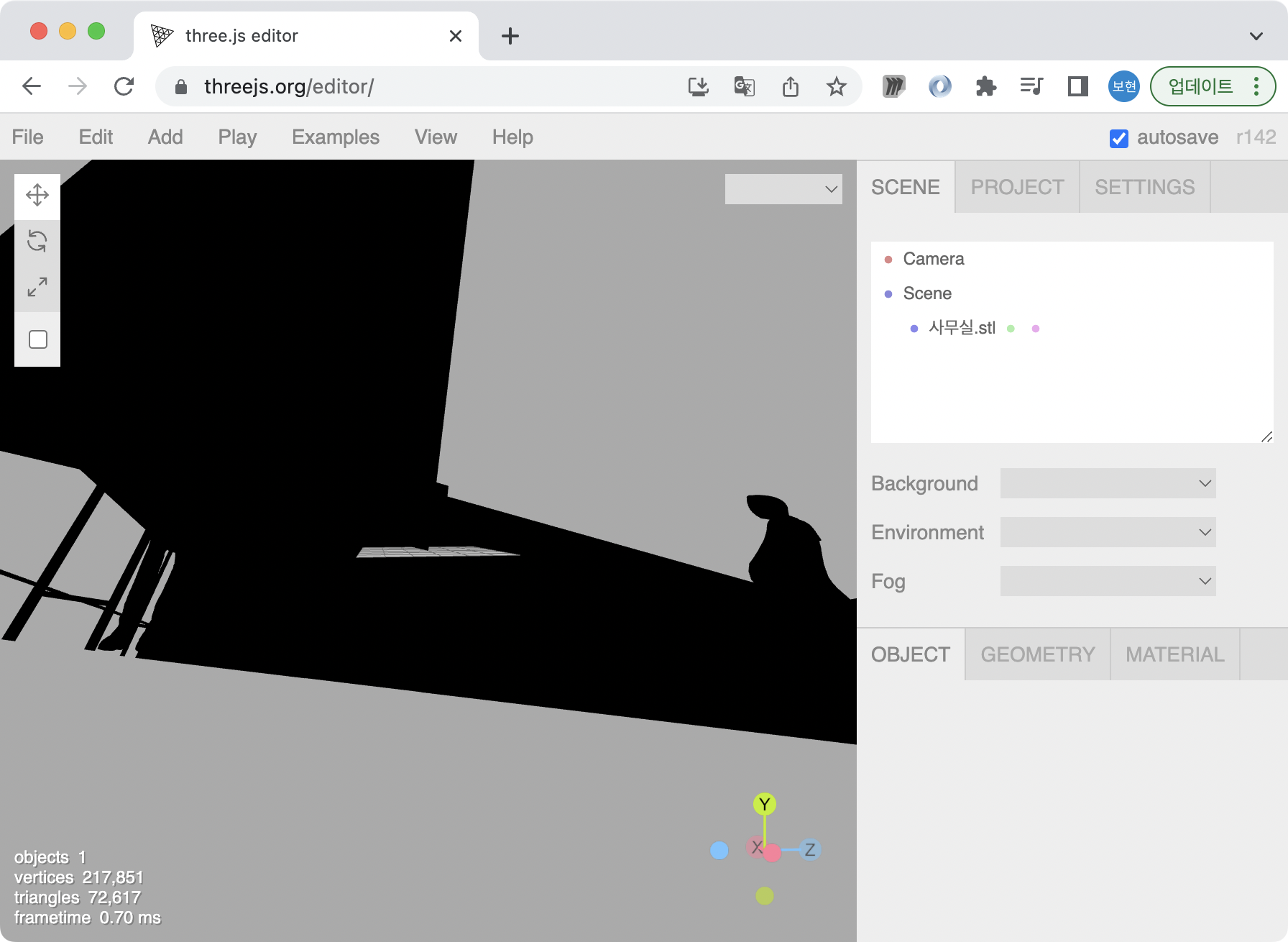 결론부터 말하자면 공짜버전으로는 안돼~~~ 프리 버전인 스케치업 웹에서는 skp, png, stl 3가지 형태로 다운로드가 가능한데. 어차피 threejs에는 skp loader같은 건 없고 png는 그냥 이미지고 남는게 stl이야. 찾아봤더니 threejs에 stl loader는 있더라고 그래서 해봤는데 ㅎㅎ 잘 안돼.