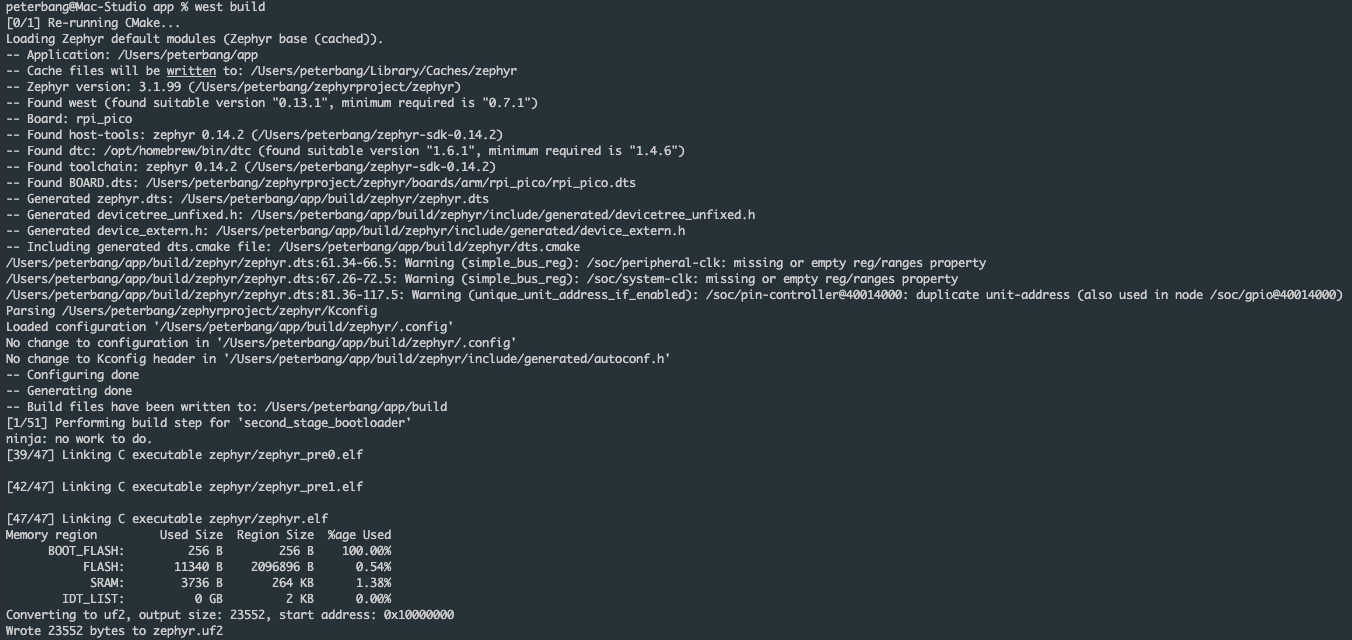 설정이 끝났으면 source 명령으로 터미널에 바로 적용시켜주고 west build로 빌드를 하면 끝!