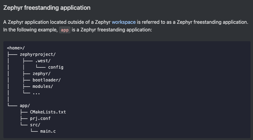 제퍼 기본 예제(Blinky)를 해봤어. 그런데 그런데 이 예제는 zephyrproject 폴더 안에 프로젝트를 생성하는 방식이라서 여러가지 새로운 프로젝트가 추가되면 뭐.. 복잡해서 보겠나? 그래서 깔끔하게 새로운 폴더 위치에 새로운 프로젝트를 생성해보자구. 우선 제퍼 문서를 조금 읽어보니 3가지 형태의 application이 있다고 해. 1. repository application과 2. workspace application은 둘 다 zephyrproject 폴더에다가 프로젝트를 만들고 유지하는 거지. 응~ 난 그렇게 안해~ 지저분해~ 별도의 workspace에다가 프로젝트 별로 새로운 폴더에 만들고 싶어. 마지막 남은 3. Zephyr freestanding application이 새로운 폴더에 프로젝트를 생성하는 방식이야.