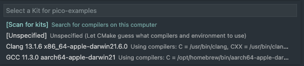 한개씩 해보자구 우선 cmake에서 사용할 컴파일러를 지정해줘야 하는데 gcc-arm-none-eabi가 없어. Scan for kits를 선택하면 알아서 찾아질 거라고 순진하게 생각하는 사람들 없겠지? 그랬으면 글로 싸질르지도 않았어 ㅋㅋ (이 창은 Shift + Cmd + P 로 커맨드 팔레트 열면 나오는 창에서 CMake: select a kit 검색으로 다시 설정할 수 있어.)