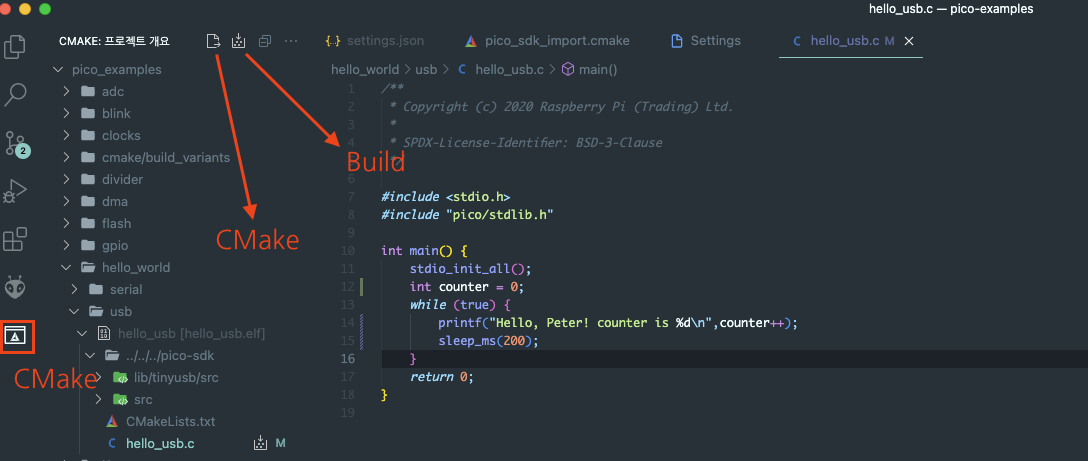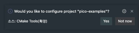자! 다 했으면 폴더 열기로 pico-examples 폴더를 열어. 그러면 오른쪽 아래에 Cmake tools 조그만 창 하나 뜰거야. Yes 눌러봐야 아무것도 안돼!!!! MacOS에서는 뭔지 모르게 하나도 안돼!! ㅋㅋ 자 포기하긴 일러 ㅋ