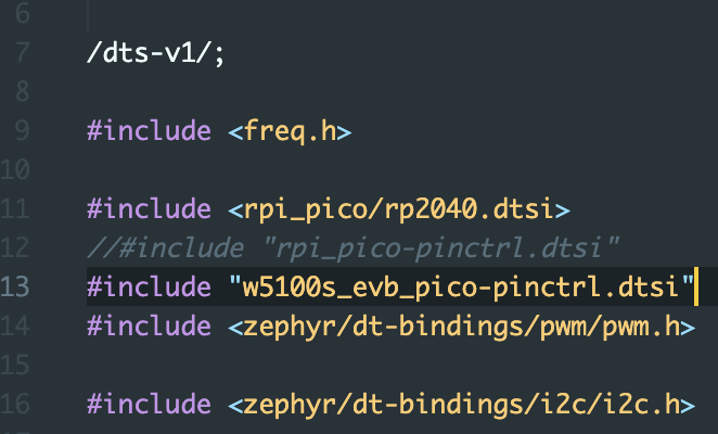 파일 내부도 조금 변경해줘야 해. w5100s에 대한 설정은 나중에 할거임. w5100s_evb_pico.dts에서 include 파일을 변경해주고