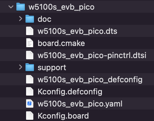 그럼 새 보드를 만들어 보자구. 우선 새 보드를 위한 폴더 -> zephyr/boards/arm/w5100s_evb_pico/ 를 생성. 그 안의 내용은 다음과 같아야 함.