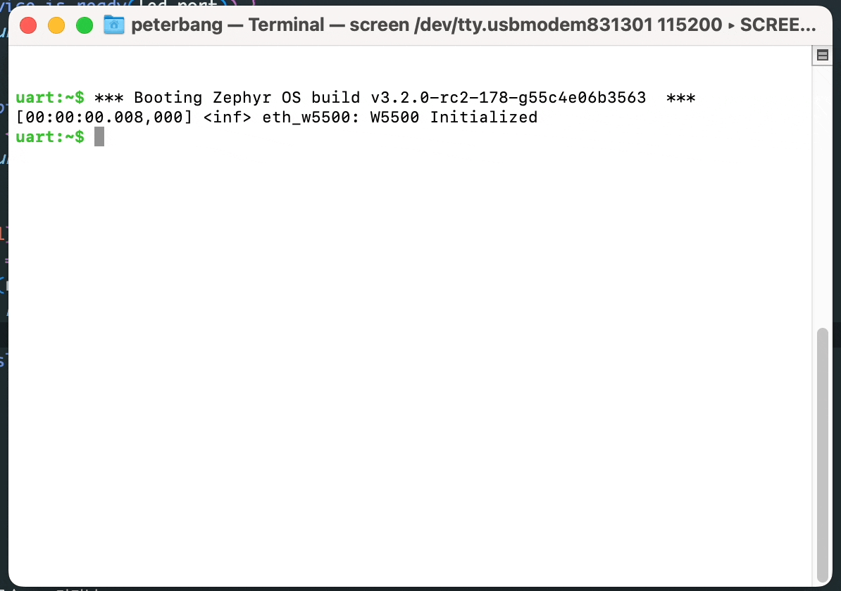 이렇게 잘 설정하고 터미널로 확인하면 제퍼가 w5500_evb_pico에서 잘 돌고 있는 걸 확인할 수 있어.👇