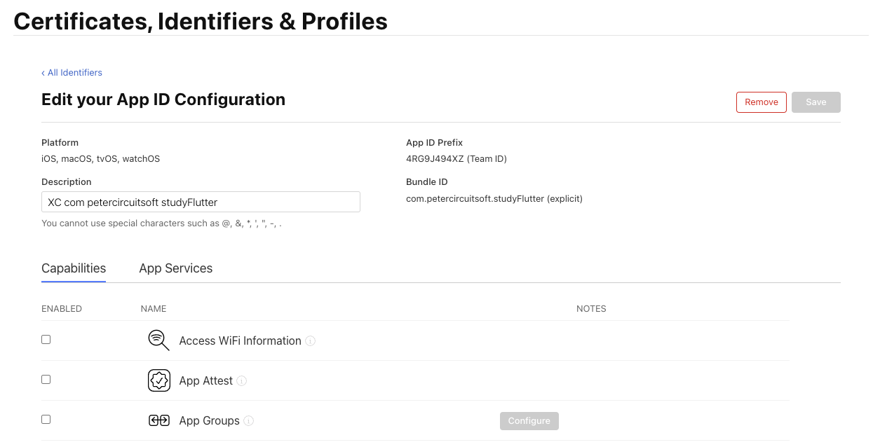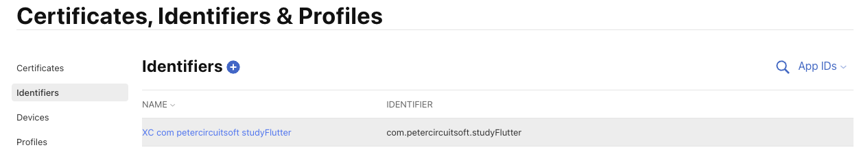 다 수정했으면 Apple Developer 사이트에서 Account -> resources -> identifiers로 넘어가면 새로 생성한 com.yourid.studyFlutter가 보일거야. 클릭하자.