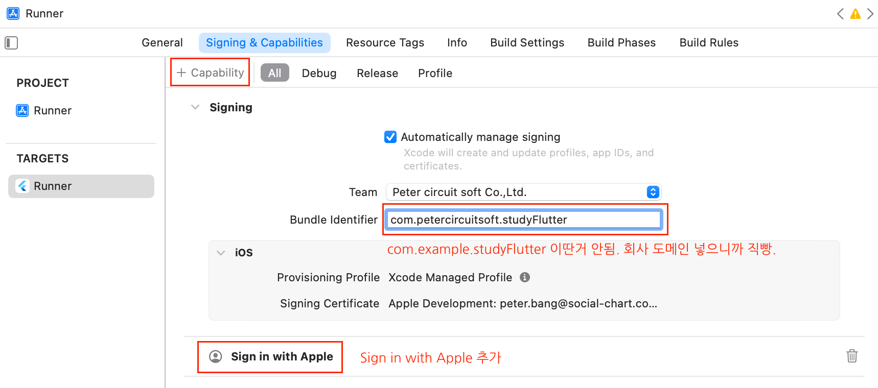 우선 Xcode에서 Runner 열고 Signing & Capabilities탭으로 가서 + Capability를 클릭해 그러면 여러가지가 많이 나오는데 그중에 Sign in with Apple를 클릭해서 추가해줘. 그리고 Bundle Identifier를 수정해줘야 하는데 com.example.studyFlutter 뭐 이딴거 안되나봐. example을 등록한 회사 이름으로 변경해주니까 등록이 되더라고.