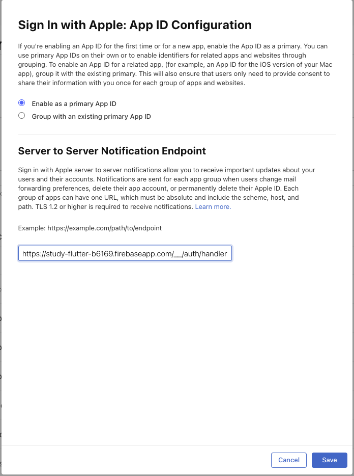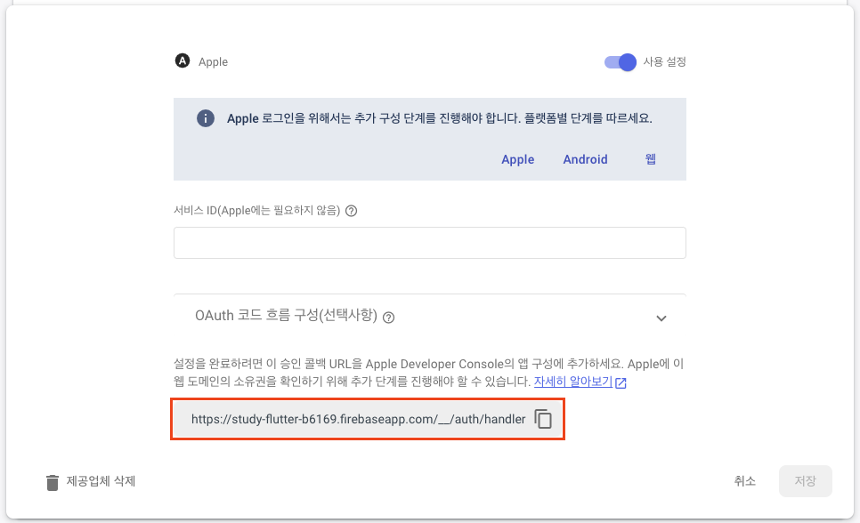 이 Endpoint는 Firebase Auth Apple Signin method 추가하는 부분에서 찾을 수 있으니 복사해서 붙여넣기!👇