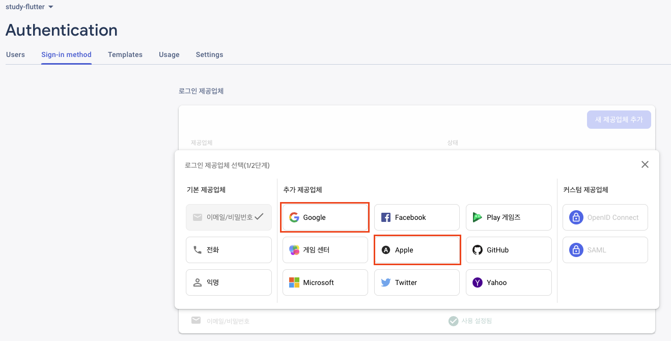 먼저 firebase Authentication 콘솔로 가서 Sign-in method 를 추가해주자. Google이랑 Apple이랑.