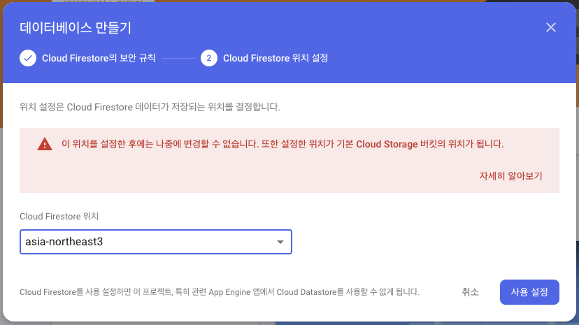 그리고 DB 위치를 선택해야 하는데 asia-northeast3가 서울 리젼이니까 난 이거 선택했음. 그런데 실제로 배포할 때는 여러가지 고려할 게 많겠지 주요 사용자의 위치라던지, 리전마다 DB 가격도 틀리니깐! (서울 리젼이 조금 비쌌던 걸로 기억함.)