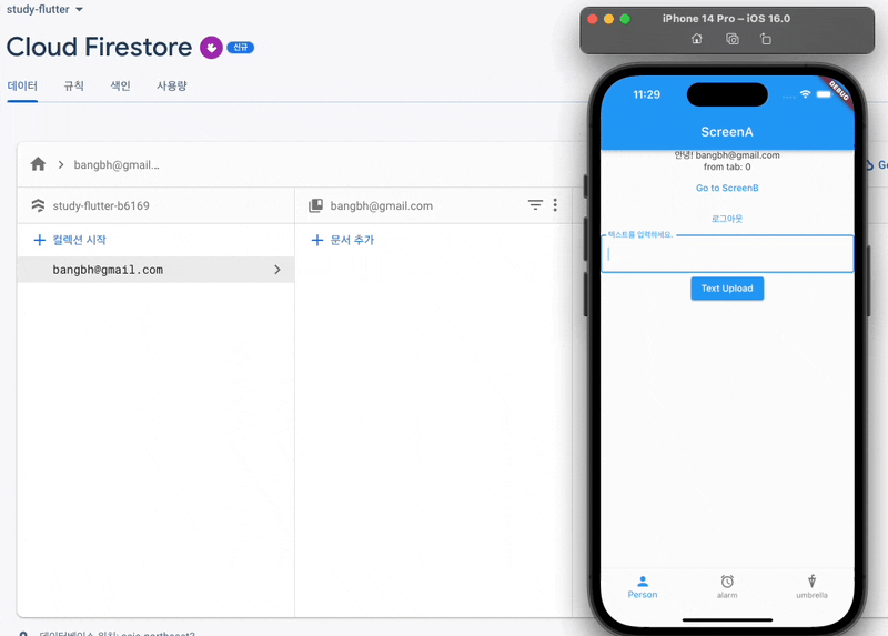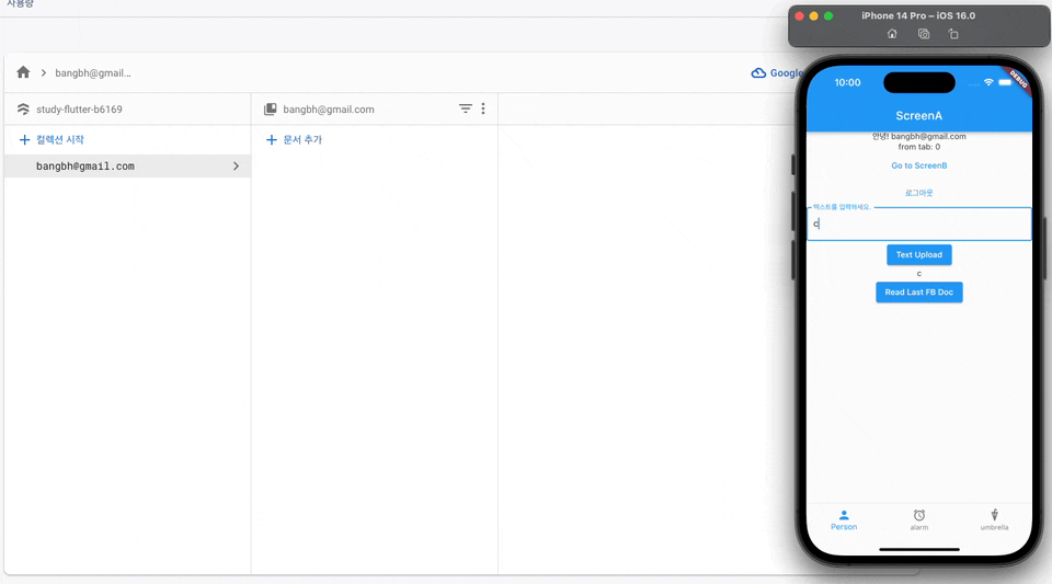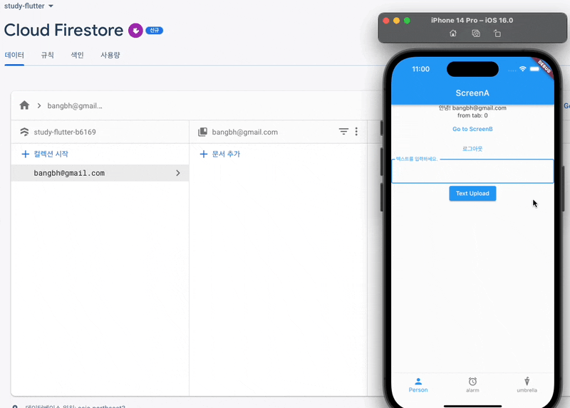 //"user@email.com" 컬렉션에 {userText:유저가 입력한 텍스트} 문서 추가!