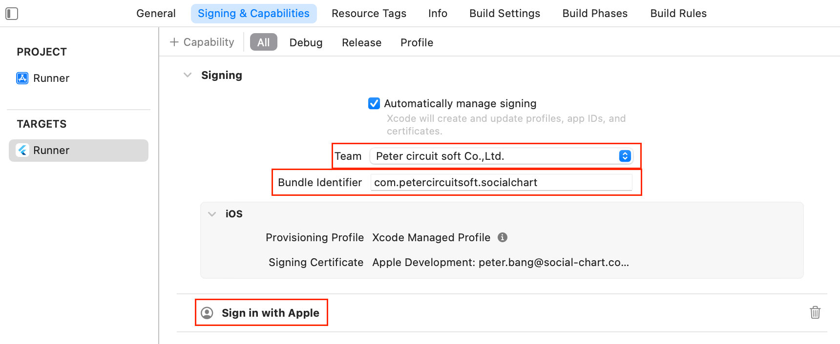 Xcode에서 사용할 계정을 선택하고 Bundle identifier가 잘 설정됐는지 확인. 그리고 애플 로그인도 사용할거니까(소셜 로그인 사용하려면 애플 로그인이 강제임.) +Capability 클릭해서 Sign in with Apple 넣자.👇