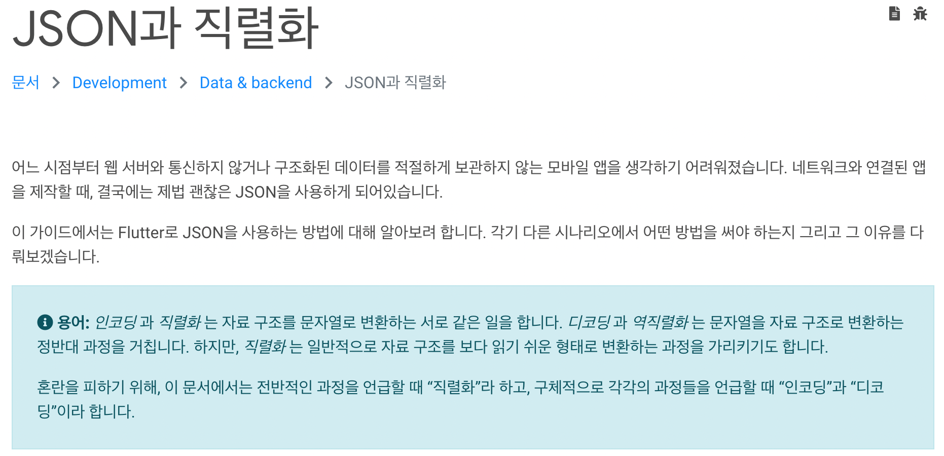 다트 입장에서 JSON 포맷의 무언가는 Map<String,dynamic> 형식의 하나일 뿐이야. 그냥 String key과 dynamic value로 이루어진 세트 정도인거지. 그래서 String key로만 JSON 내부 요소에 접근할 수 있어. 그래서 json을 object로 변환시키는 작업을 따로 해야 해. 이걸 가지고 "직렬화"라고 병신처럼 부르는데;;; (무식한 소리인지 모르지만)그냥 변환 정도로 하면 안되나 싶어;;