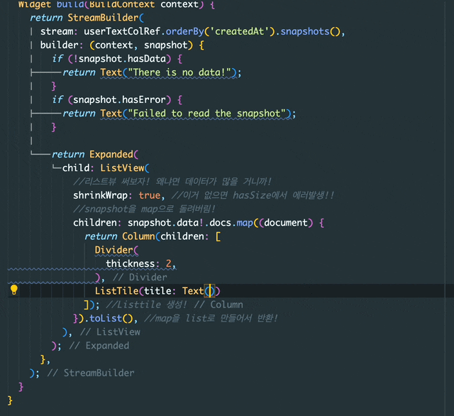 return ListTile(title: Text(data['userText']));//이렇게 읽어야함????