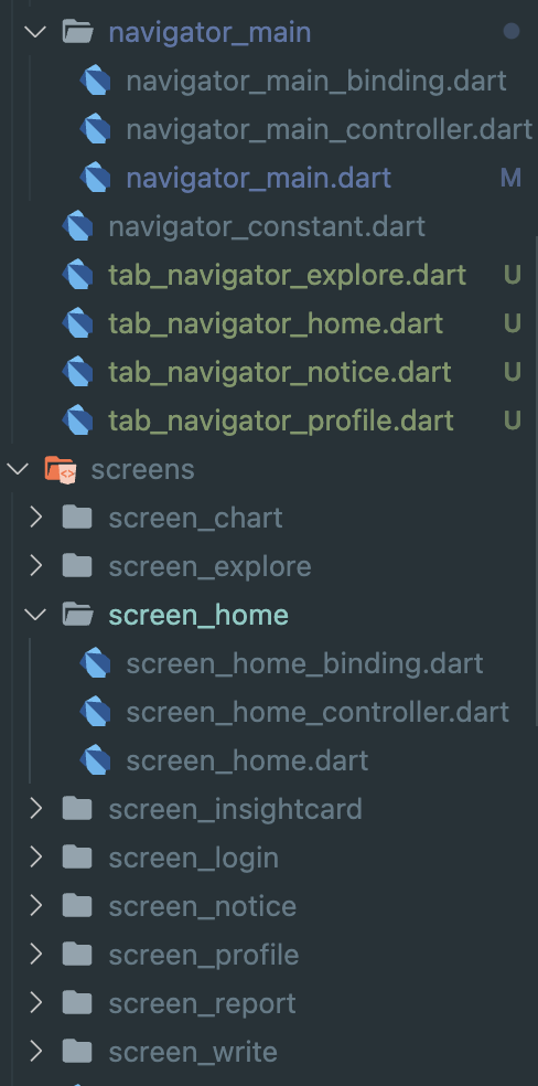 get으로 router 시스템을 변경하면서 스크린이나 그 컨트롤러를 여러 navigator에서 재활용하는 게 매우 간편해졌고 스크린에 argument를 전달하는 것도 마찬가지로 쉬워졌어. 이렇게 변경하는 과정에서 각 screen이나 navigator는 binding 파일과 controller 파일을 가지도록 만들고 있어. controller나 binding이 당장 필요하지 않은 건 만들지 않았지만 나중에는 다 만들어 둘라고 ㅋㅋ 왜? 걍 버릇을 들이려고 하는 것도 있고 언제 또 controller가 필요할 지 모르는데 그 때마다 허둥지둥하고 싶지 않아서..