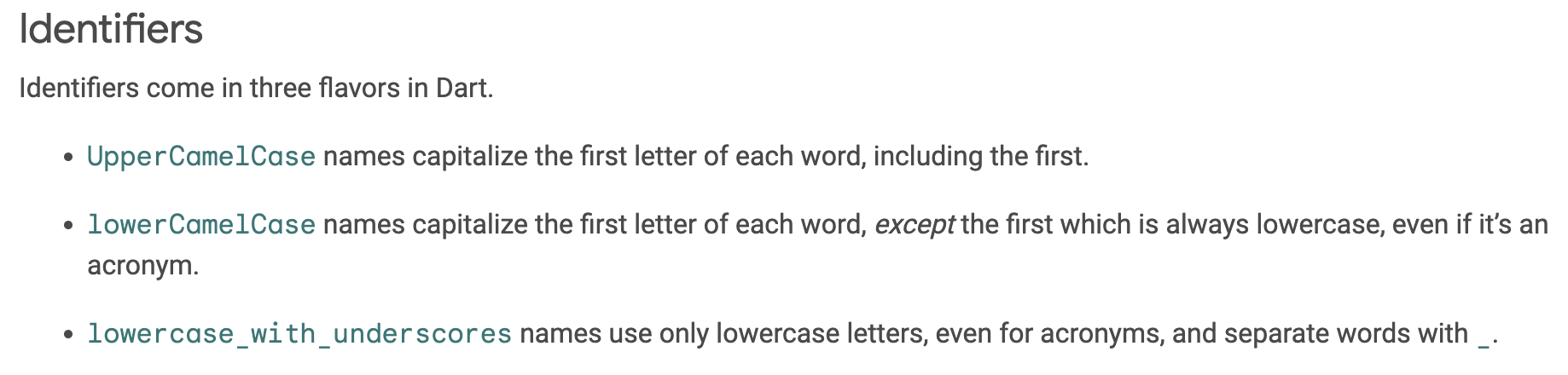 기본적으로 UpperCamelCase, lowerCamelCase 그리고 lowercase_with_underscores 이렇게 3가지가 있는데 위에서 언급한 것처럼 파일, 폴더, 라이브러리는 lowercase_with_underscores를 사용하고 Class 같은 type을 나타내는 애들은 UpperCamelCase, 그리고 그 type의 instance나 constant는 lowerCamelCase 사용을 추천한다고 되어 있어.