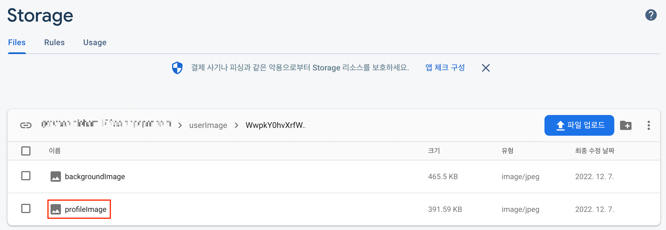 이 과정이 잘 완료되면 firebase storage에는 userImage/유저id/profileImage라는 이름으로 파일이 잘 생성되겠지 👇