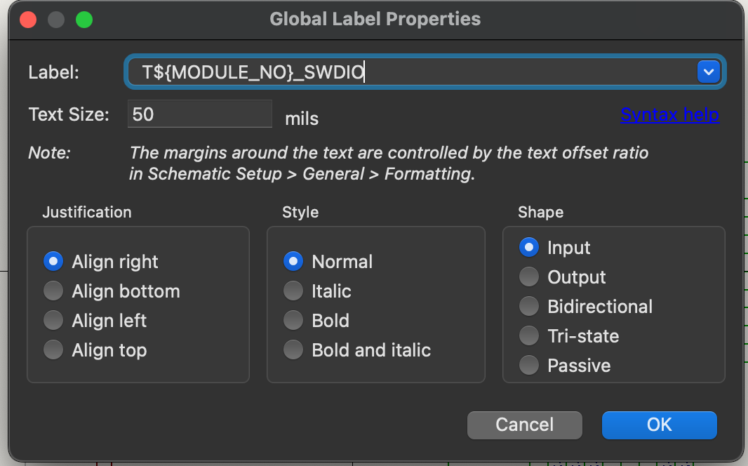 kicad에도 뭔가 이런 경우를 대비해서 변수를 넣는다던가 할 수 있을 것 같더라고 그래서 이리저리 찾다보니 핀 라벨다는 창을 보니 Syntax help 라는 부분이 있고 말이지 ㅋ