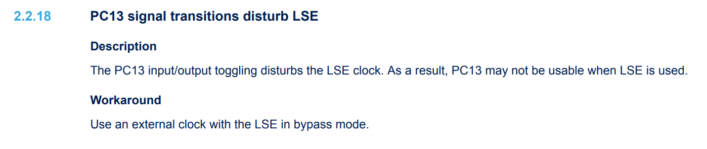 여기에 보면 PC13번이 LSE(32.768khz)를 방해한다는 내용이 있어.