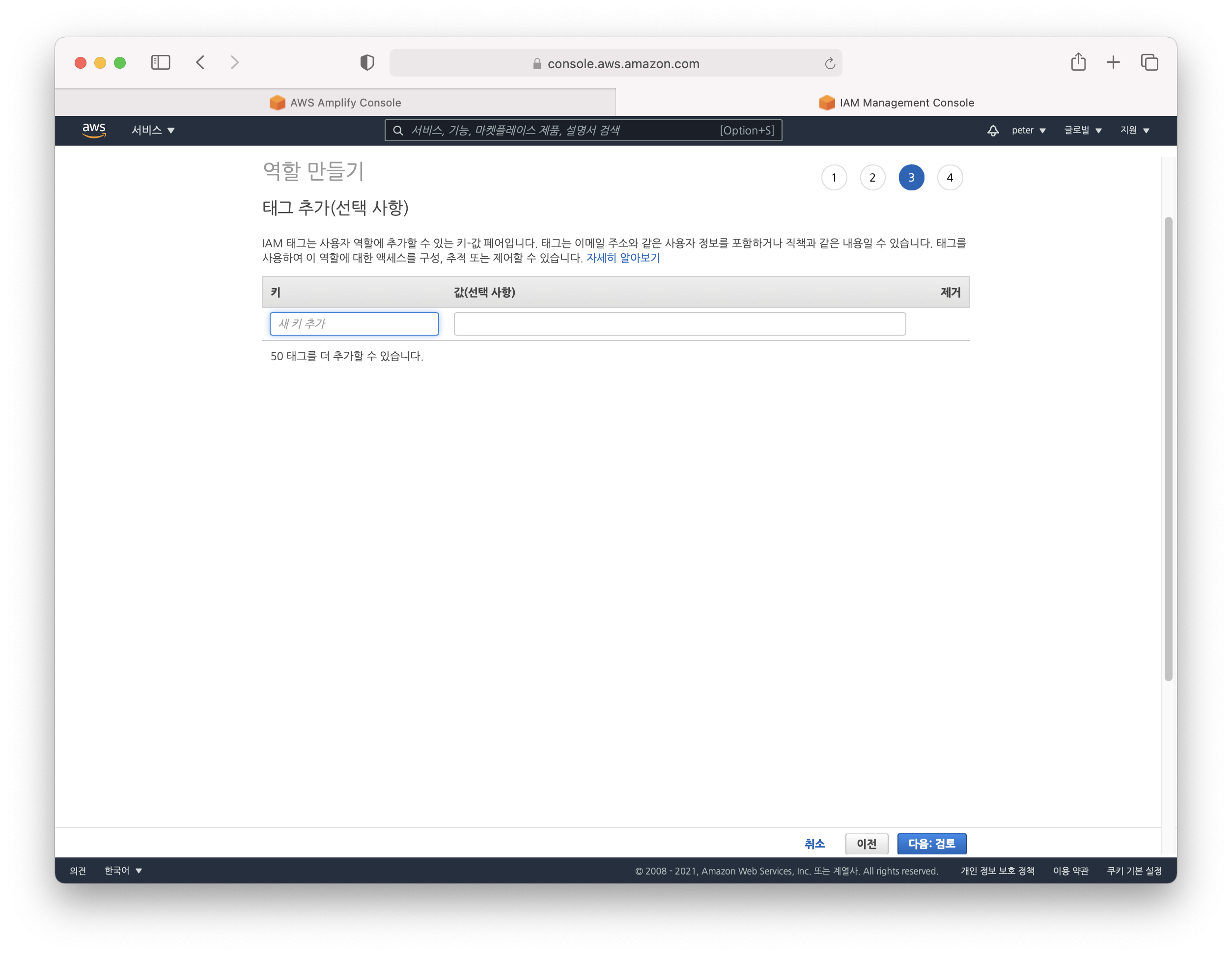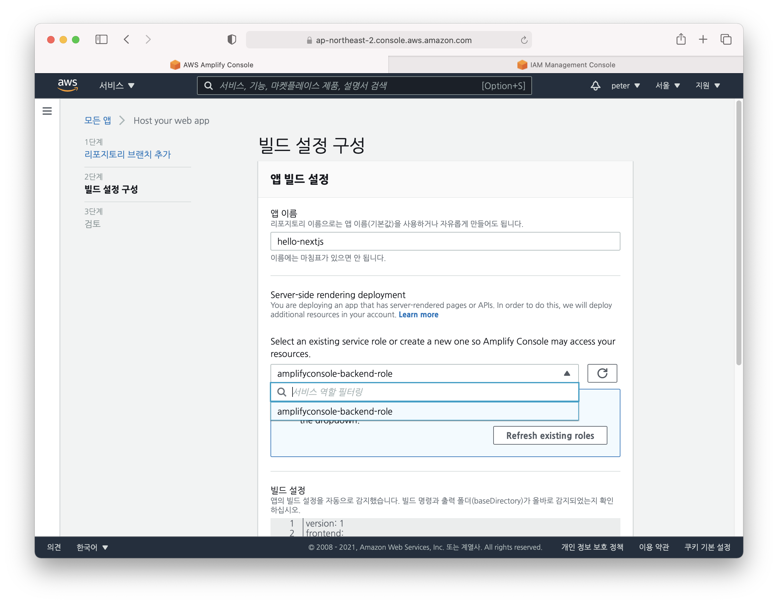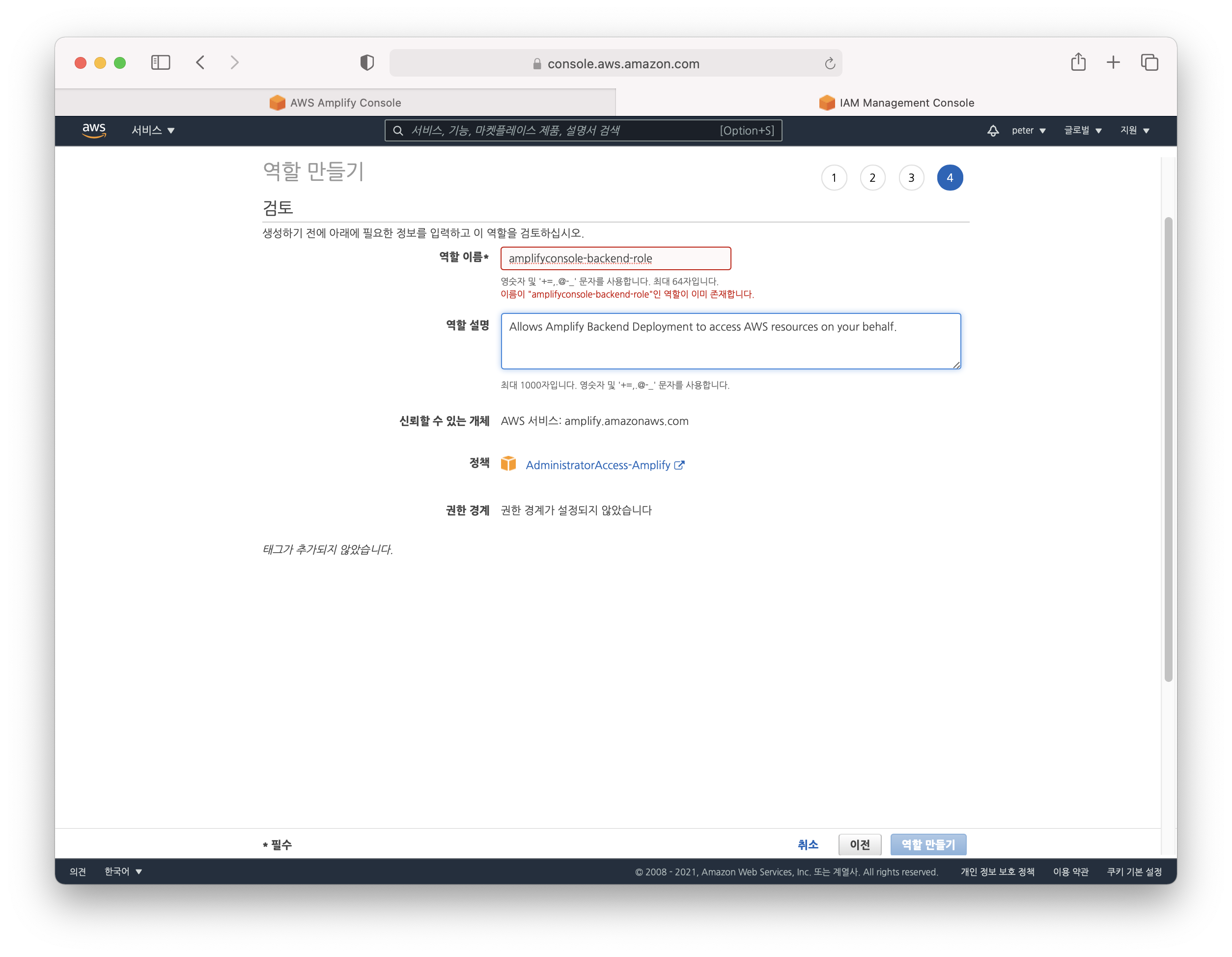 그러고 나면 amplifyconsole-backend-role 이라는 이상한 이름이 자동으로 설정될텐데 저는 이미 만들어져 있어서 경고가 나오는 거에요. 여러분들은 그냥 역할 만들기 클릭해서 완료하시면 됩니다.