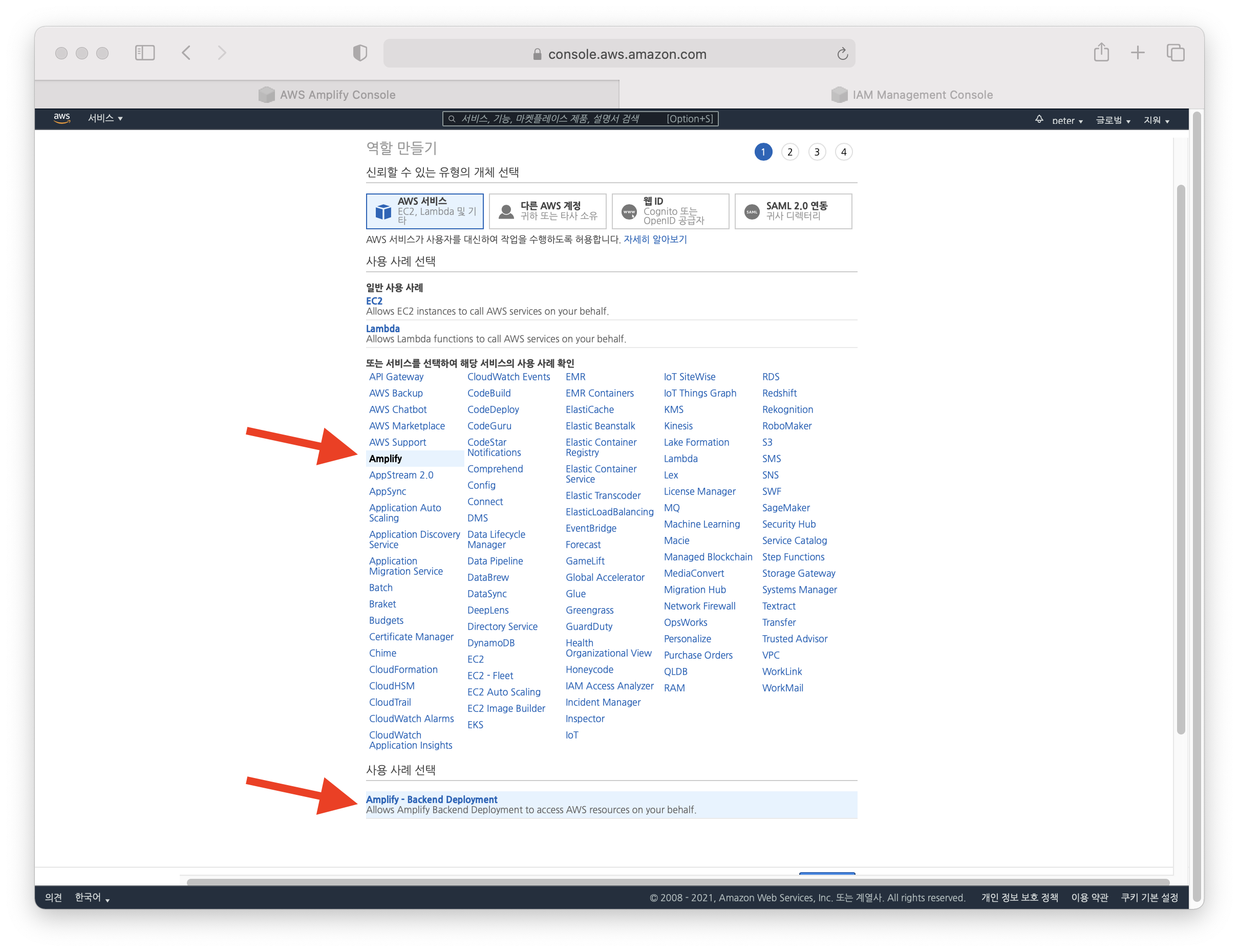 처음 amplify 사용하시면 role 설정이 안되어 있을텐데 그럼 새롤을 만드시면 됩니다. 쫄지 마시고 ㅎㅎ 아래 화면처럼 amplify 선택 -> 사용 사례는 하나뿐이 없어요.