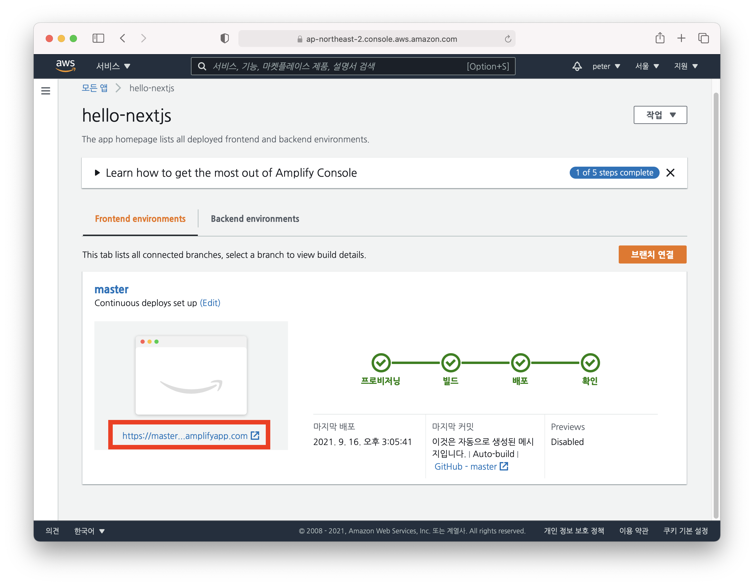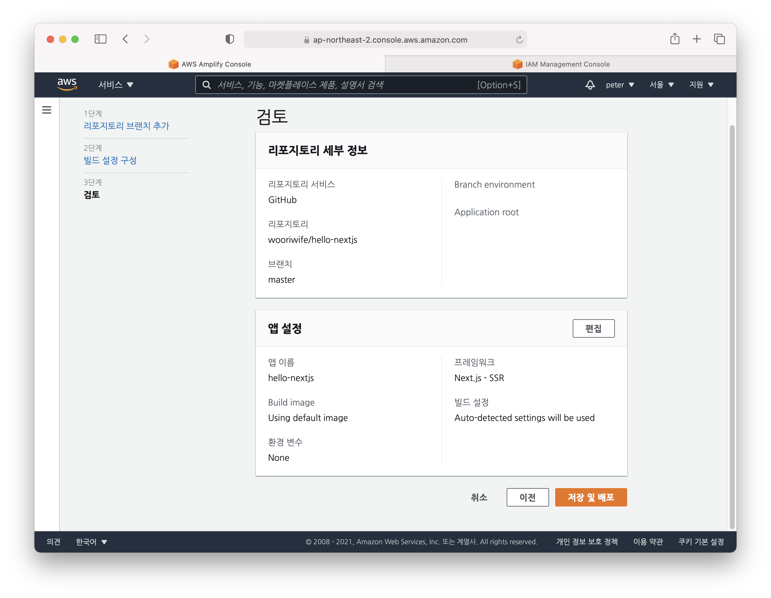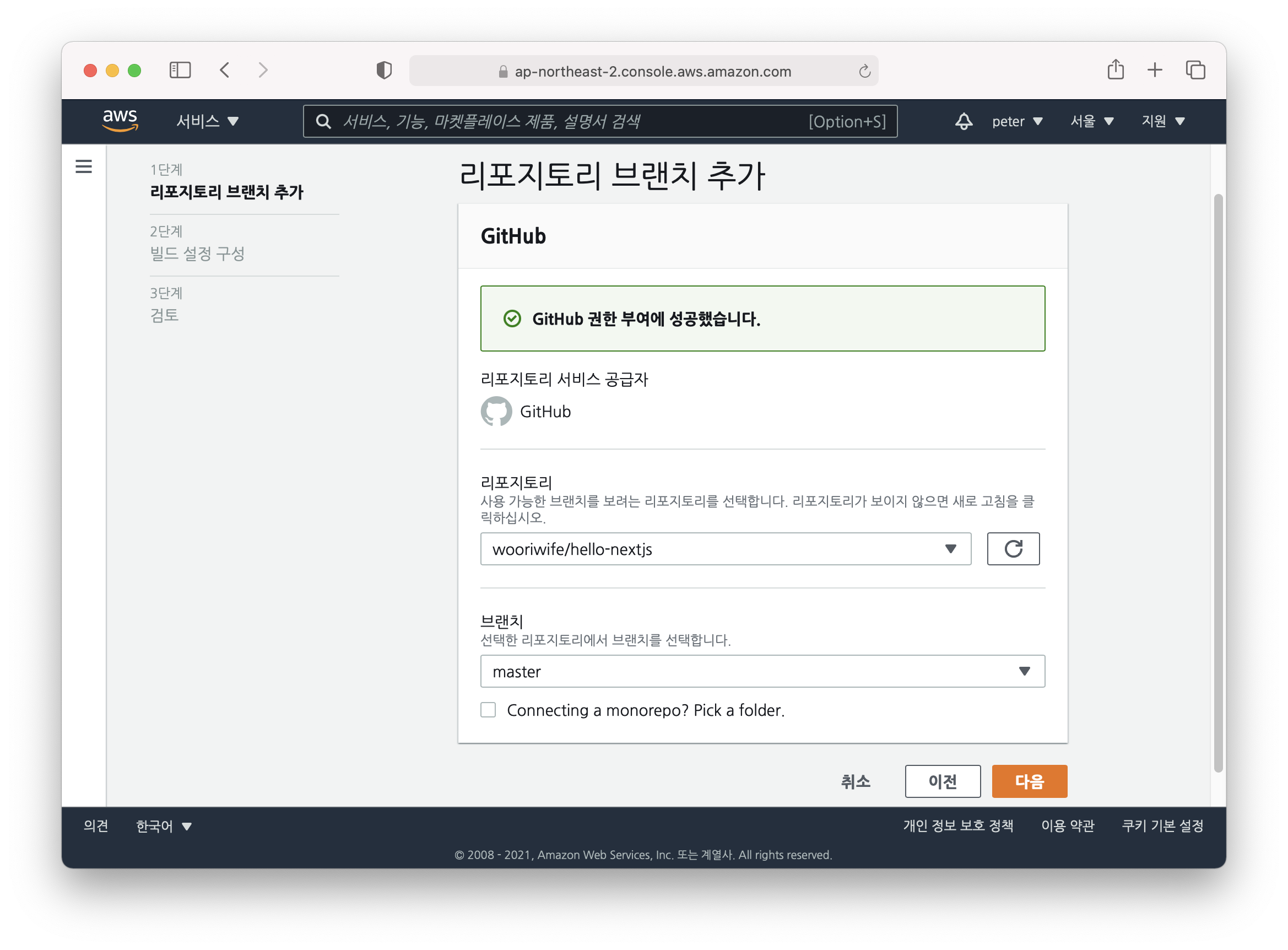 다음에는 AWS가 깃헙의 권한을 얻어오는 단계가 나올텐데 ㅠㅠ 저는 이미 되어 있어서 아래 화면처럼 나오네요. 당황하지 마시고 깃헙 권한을 AWS에 주는 새창이 뜨면 허락하시면 됩니다. 그리고나서는 조금 전에 배포했던 hello-nextjs 레파지토리를 선택, 그리고 마스터 브랜치 선택 후 다음으로 넘어가시면 됩니다.