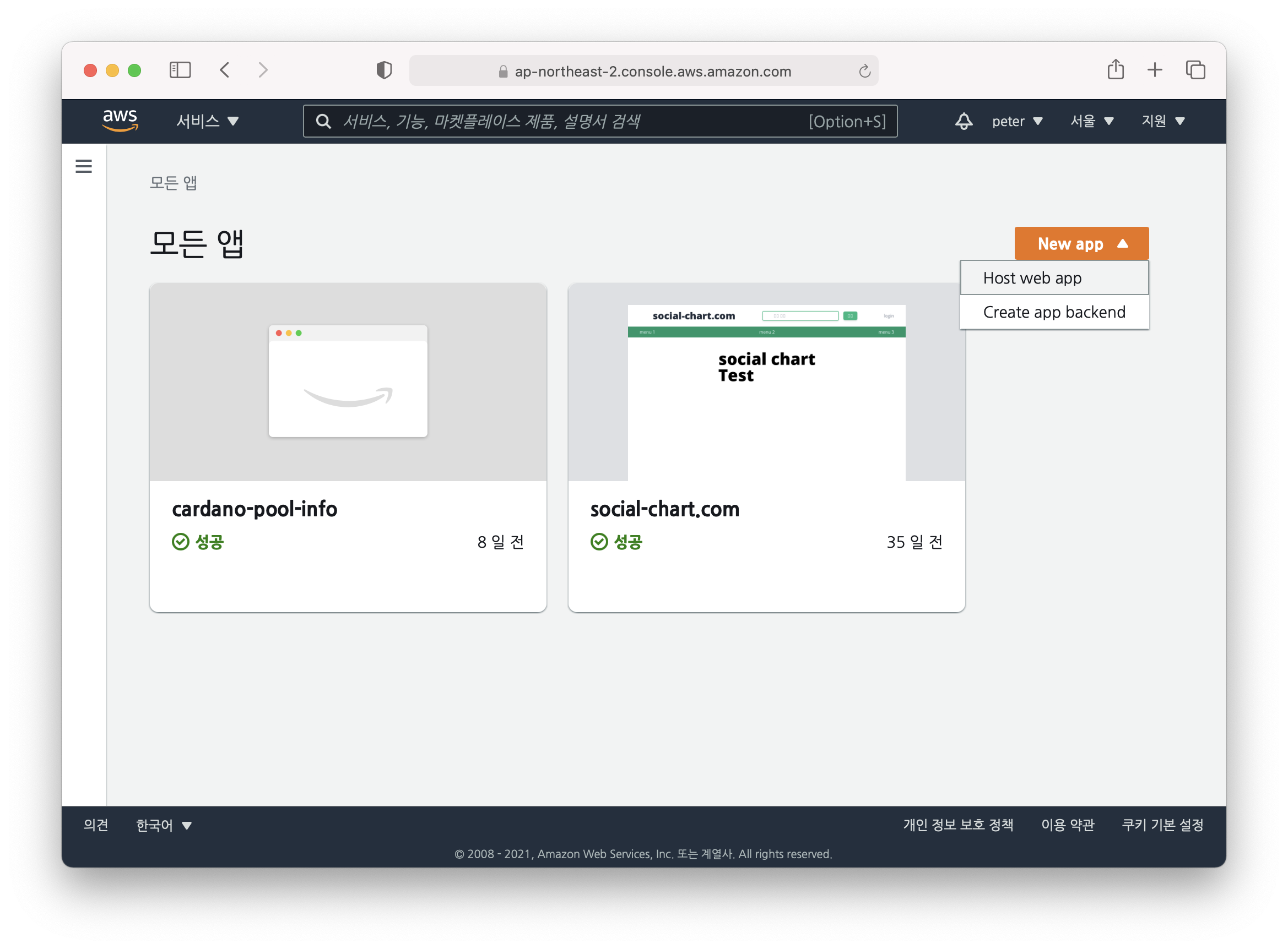 자 다음은 AWS amplify 차례입니다. 전 이미 몇개 프로젝트가 있어 화면이 다르실 수 있어요. 참고하시구요. New app을 눌러 새로운 프로젝트를 시작해봅시다. Host web app 선택