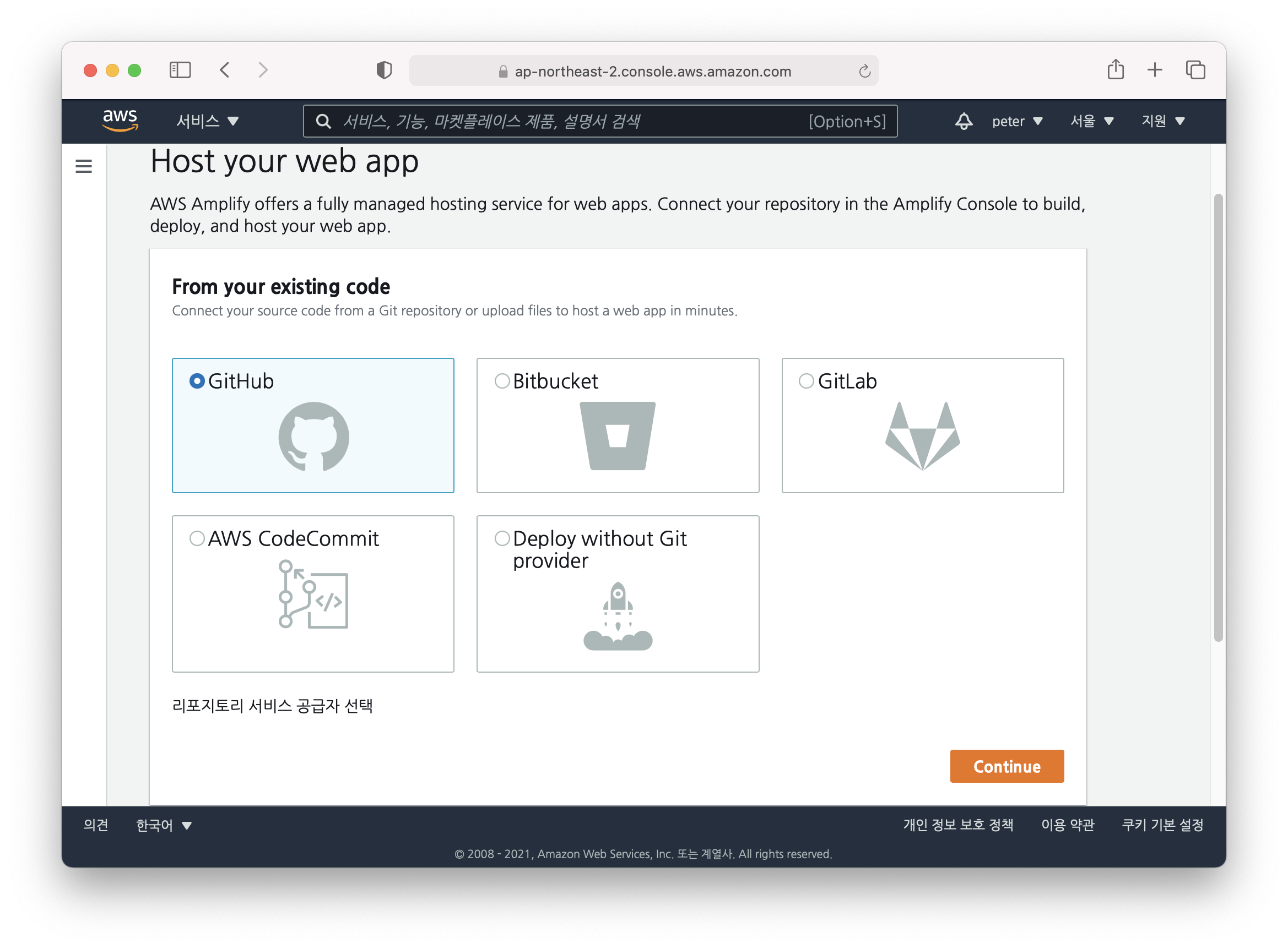 깃헙 이외에 여러가지 옵션들이 있는데 상황에 맞게 사용하시면 될 것 같습니다. 저는 일단 깃헙 선택 후 continue!