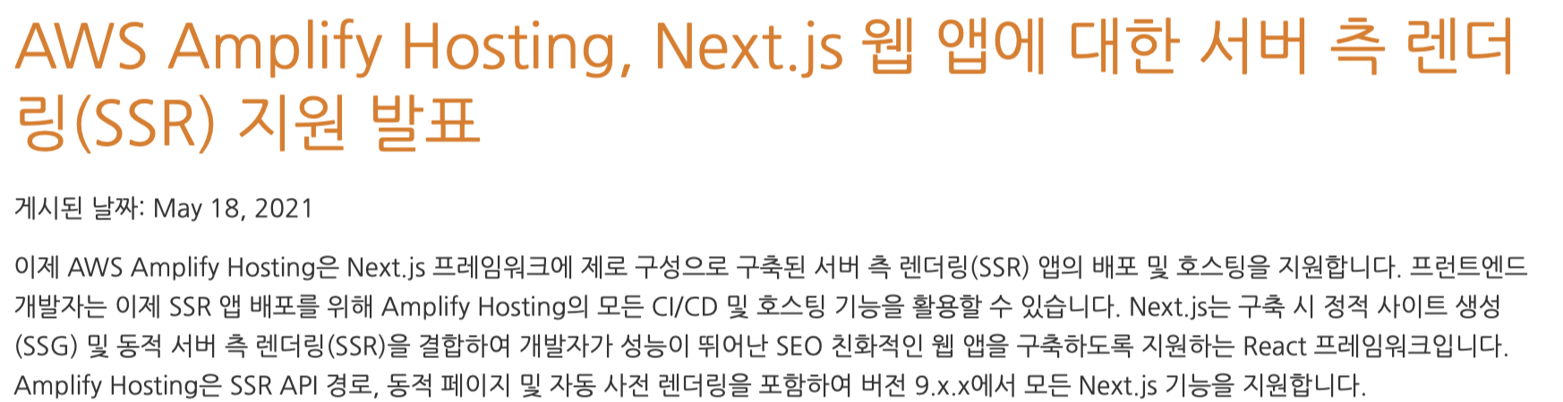 처음에는 Firebase Function 이나 Lambda를 사용해야 하려나 하고 찾아봤는데 AWS Amplify Hosting에서 Next.JS 서버 측 렌더링 지원한다는 글을 보게 되었어요 느흐흐흐 못참지 새로 나온건 해봐야지
