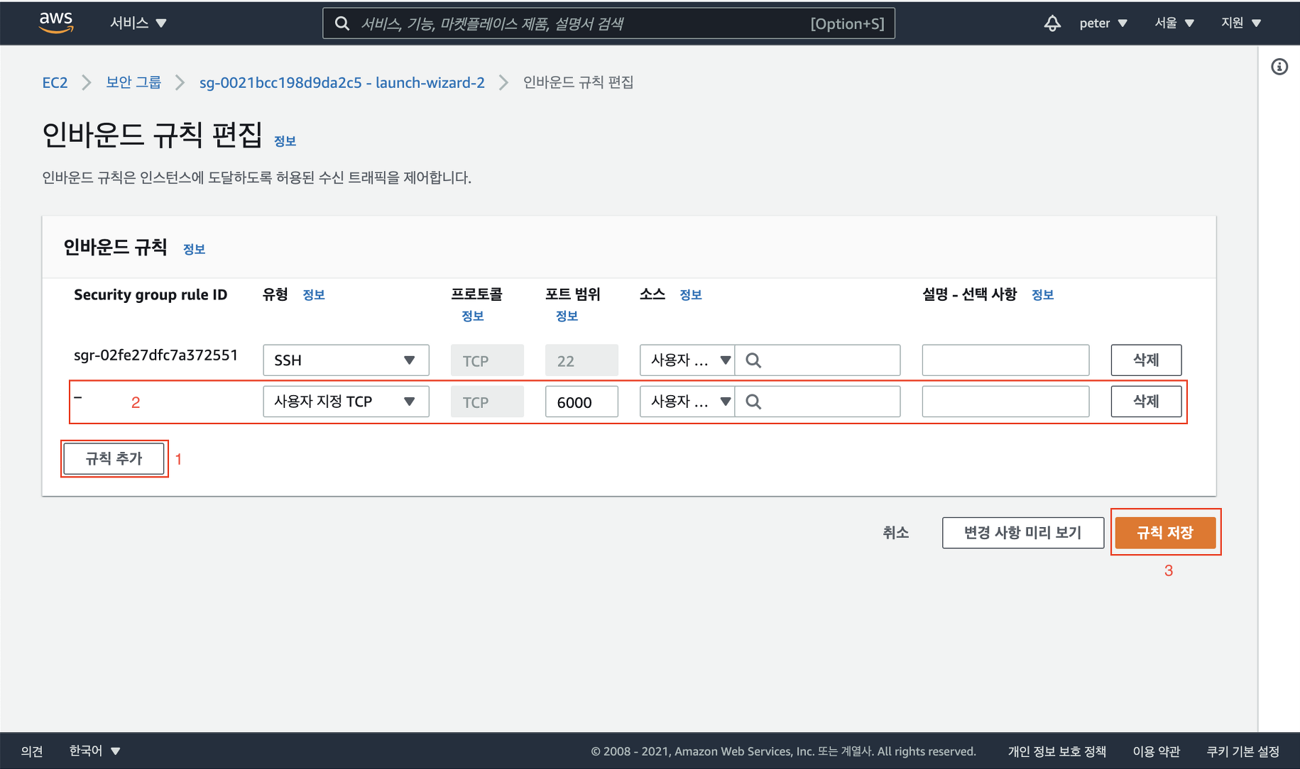 규칙 추가 버튼 클릭하여 인바운드 규칙을 추가 합니다. 유형에 사용자 지정 TCP, 포트 범위에는 자신이 설정한 포트 번호, 그리고 마지막으로 소스는 자신의 IP 혹은 anywhere-ip4를 선택 후 규칙 저장을 눌러 보안 설정을 완료합니다.
