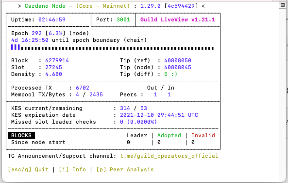 노드 상태를 로그만으로 파악하는 건 무리가 있기 때문에 터미널 위에서 중요한 노드 정보를 보여주는 gLiveView라는 로컬 모니터링 툴을 설치하여 상태를 확인합니다.