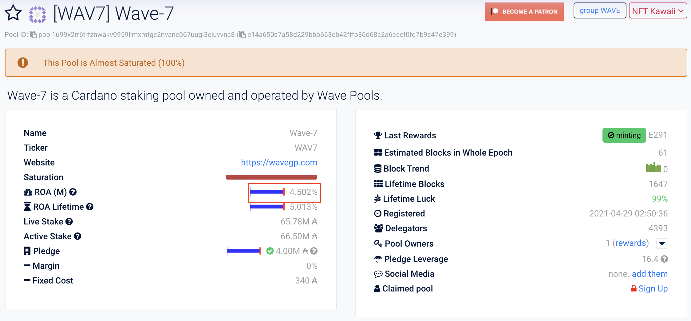 10K(10,000) ADA를 WAV7 스테이킹 풀에 1 epoch, 즉 5일 위임한 결과를 공유합니다.