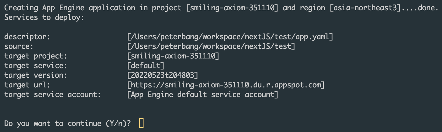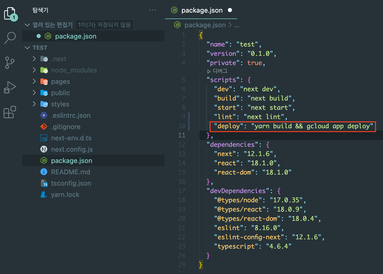 먼저 next.js 프로젝트에 package.json 열어서 "deploy":"yarn build && gcloud app deploy" 추가해 주자. 굳이 설명하자면 빌드하고 배포하는거지.