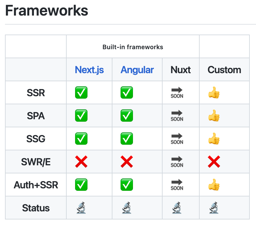 아래는 현재 지원하는 web framework 목록인데 next.js랑 angular만 되고 기능들 중에는 SWR/E가 안된다는데 -_- 음 이거 swr 이거 데이터 fetch 훅 말하는 건가? 음 암튼 베타 테스터 원숭이답게 이러저리 SSR 기능들 테스트 해봐야겠어. SSR 하려면 결제 계정 활성화 해야 하나봐 참고~(내돈까지 써가면서 테스트 해야 하는 건가 -_-????)