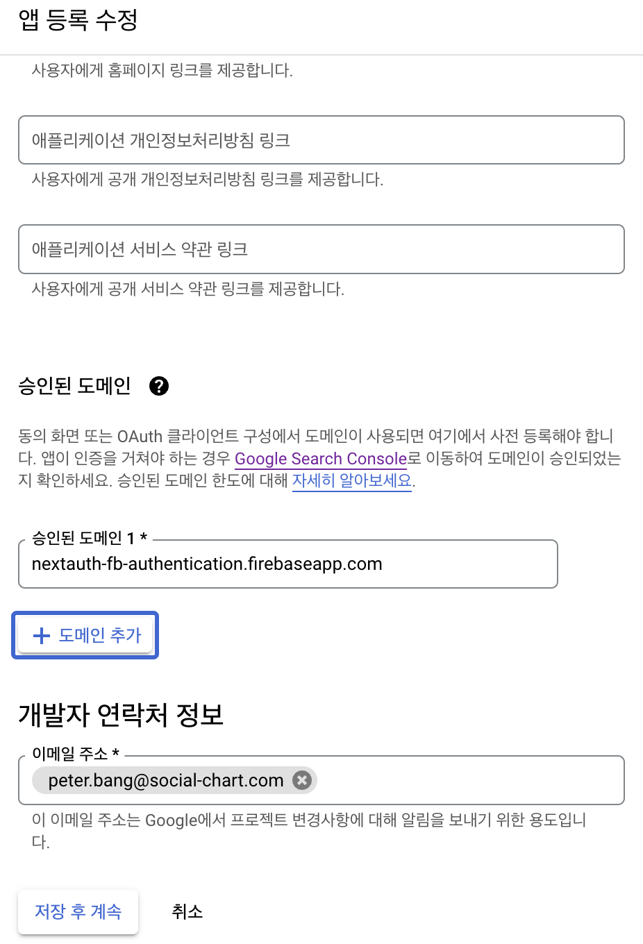 다음 화면에서 사용자 지원 이메일이랑 개발자 연락처 정보만 넣고 다음으로 고고!