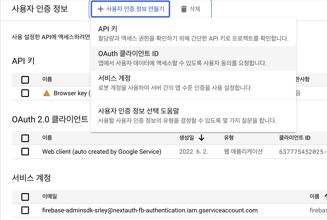 버튼 누르면 동작은 하는데 google 로그인 화면까지 가지도 않을거야 동작하지 않을 거야. Google 로그인을 사용하려면 GCP에서 새 프로젝트를 만들고 GOOGLE_CLIENT_ID, GOOGLE_CLIENT_SECRET 같은 정보를 얻어 와야 해. 난 Firebase 통해서 프로젝트 만들거야. 어차피 authentication이랑 연동도 할거니까 말이지. 프로젝트를 만들었으면 GCP 콘솔에서 사용자 인증정보 탭으로 가자고.