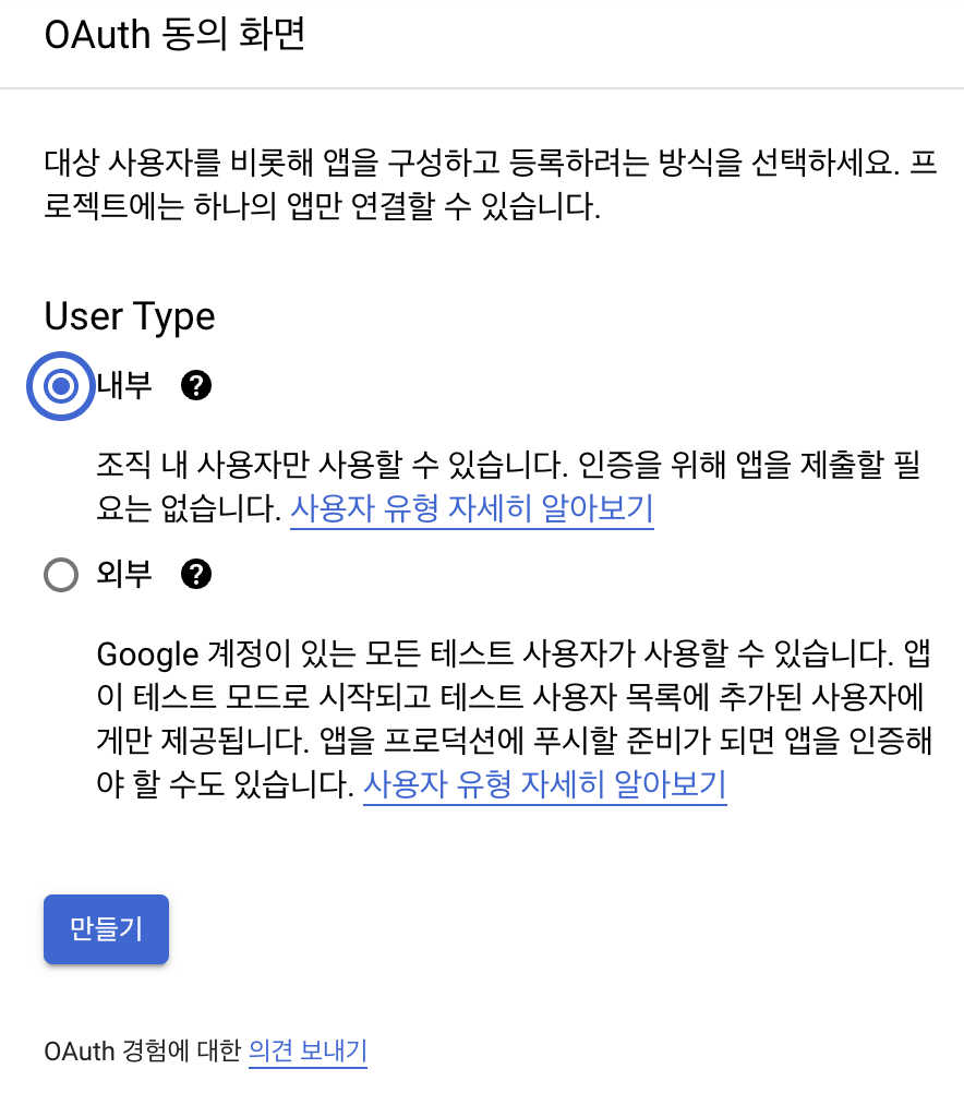 내부, 외부 선택하는게 나오는데 내부 선택하면 자신의 구글 계정만 로그인이 가능해. 나중에 변경 가능하니깐 걍 내부 고고!