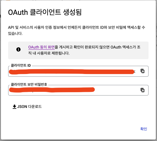 아이고 GCP 설정하는게 더 지치네~ 스샷 따느라 지치는 건가? ㅎㅎ 이제 드디어 클라이언트 ID하고 클라이언트 secret을 얻었네.