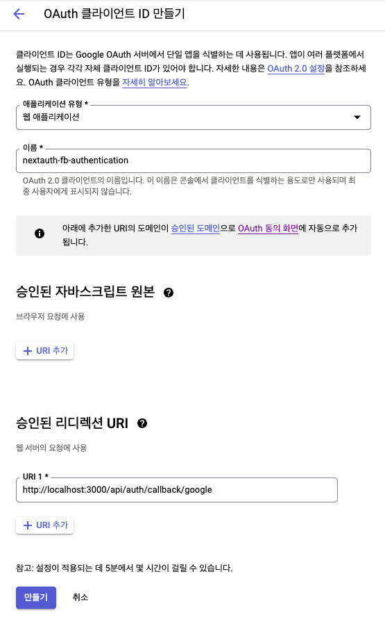 애플리케이션 유형은 웹 애플리케이션으로 설정하고 이름, 승인된 리다이렉션 URI를 입력해야 해.