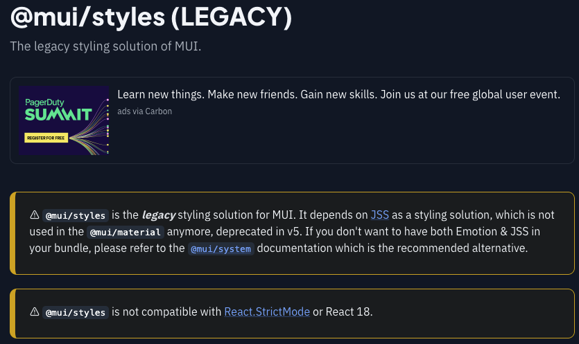 설치 후 딱히 다른 작업 없이 mui를 바로 사용할 수 있지만 css 리셋이랑 SSR 정도는 설정해주자구 _app.tsx(js)와 _document.tsx(js) 파일들을 수정해서 말이지. 보통 다른 블로그에서는 nextjs + mui ssr 설정할 때 @mui/styles 에서 ServerStyleSheets()로 스타일 추출해서 때려박는 방식을 쓰고 있길래 나도 해보려고 봤더니 모듈이 deprecated인거야. 그럼 쓰면 안되잖아~