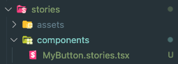 이제 스토리북에 만들 버튼만 따로 넣어보자구. stories폴더에 components 폴더를 새로 하나 만들고 MyButton.stories.tsx 파일을 생성!