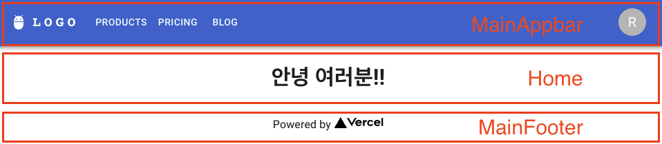 그야말로 Layout 컴포넌트. MUI의 appbar랑 기존 next.js footer를 활용해서 MainAppBar랑 MainFooter를 만들고 위 아래로children(페이지)를 감싸주는 형태로 했어. MainAppBar랑 MainFooter는 github 참고하자 너무 길어~ 이렇게 하고 나면 아래와 같은 결과~ 요런식으로 해주면 이제 슬슬 뭔가 보인다 그치?