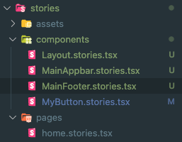 자 협업을 컴포넌트 드리븐!! 스토리북에도 넣자고. 세개 전부 다. MainAppbar랑 MainFooter 그리고 Layout까지! 우선 기존 example 싹 다 지워주고 stories/components 폴더에 스토리 파일 3개 추가하자구~ 다 해봤잖아? ㅎㅎㅎ